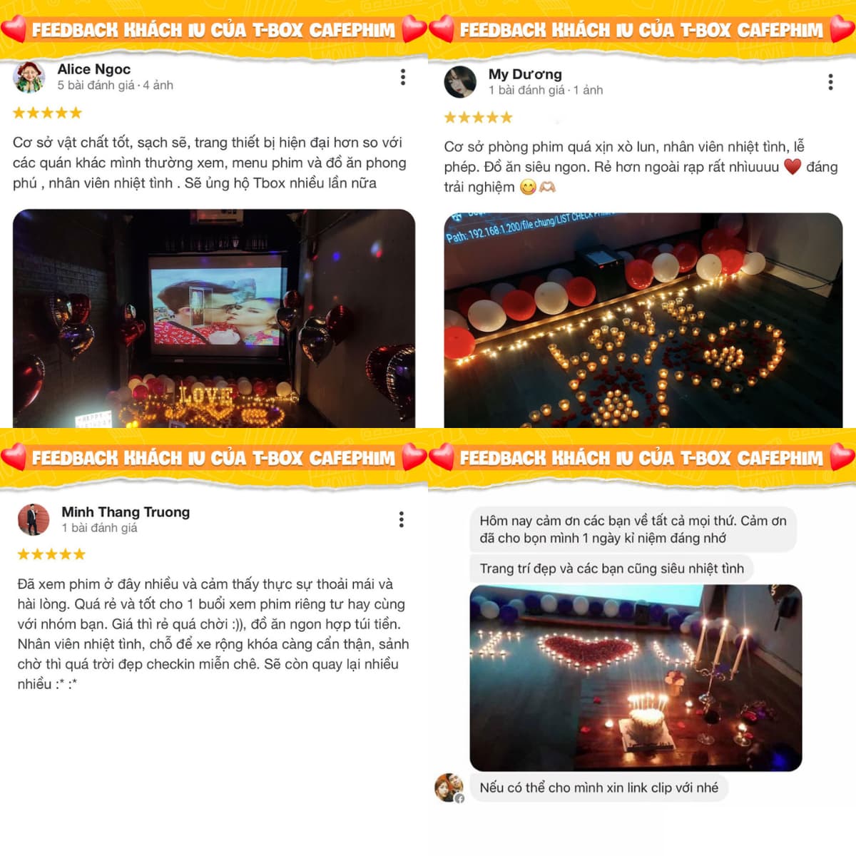 Để buổi xem phim hẹn hò tại Tbox Cafe diễn ra lãng mạn hoặc tránh trường hợp hết phòng, bạn vui lòng đặt trước để được tư vấn và nhận trải nghiệm tốt nhất.