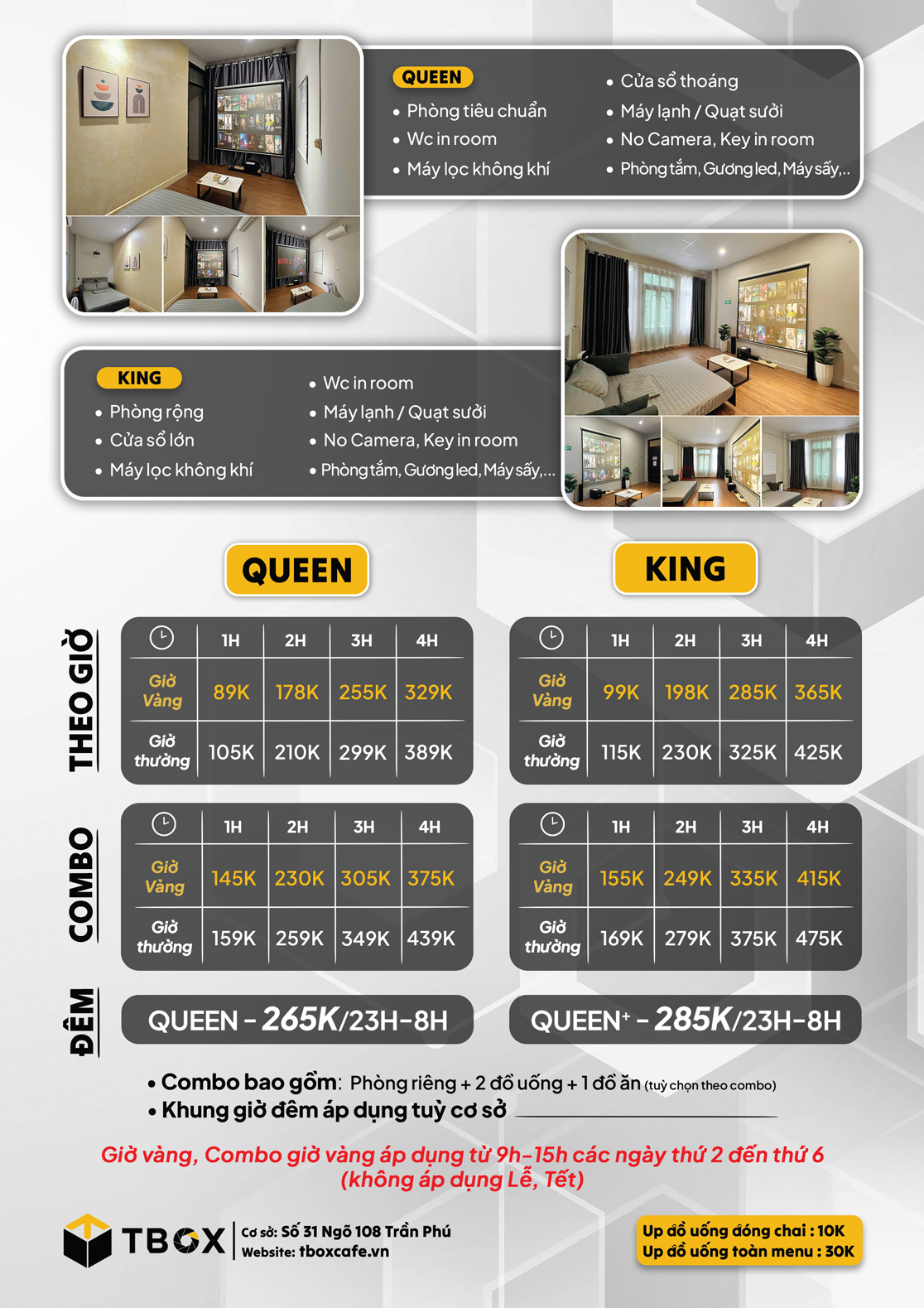 Anh em ở loanh quanh khu vực Nguyễn Trãi - Trần Phú không cần phải lo hết phòng rồi chạy xe sang tận các cơ sở khác để đặt phòng nữa. Chỉ cần đến một cách nhanh - gọn - lẹ và tận hưởng những giây phút hẹn hò lãng mạn cùng người ấy, mọi chuyện còn lại đã có T-Box lo.