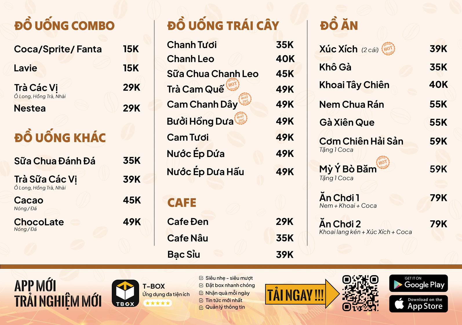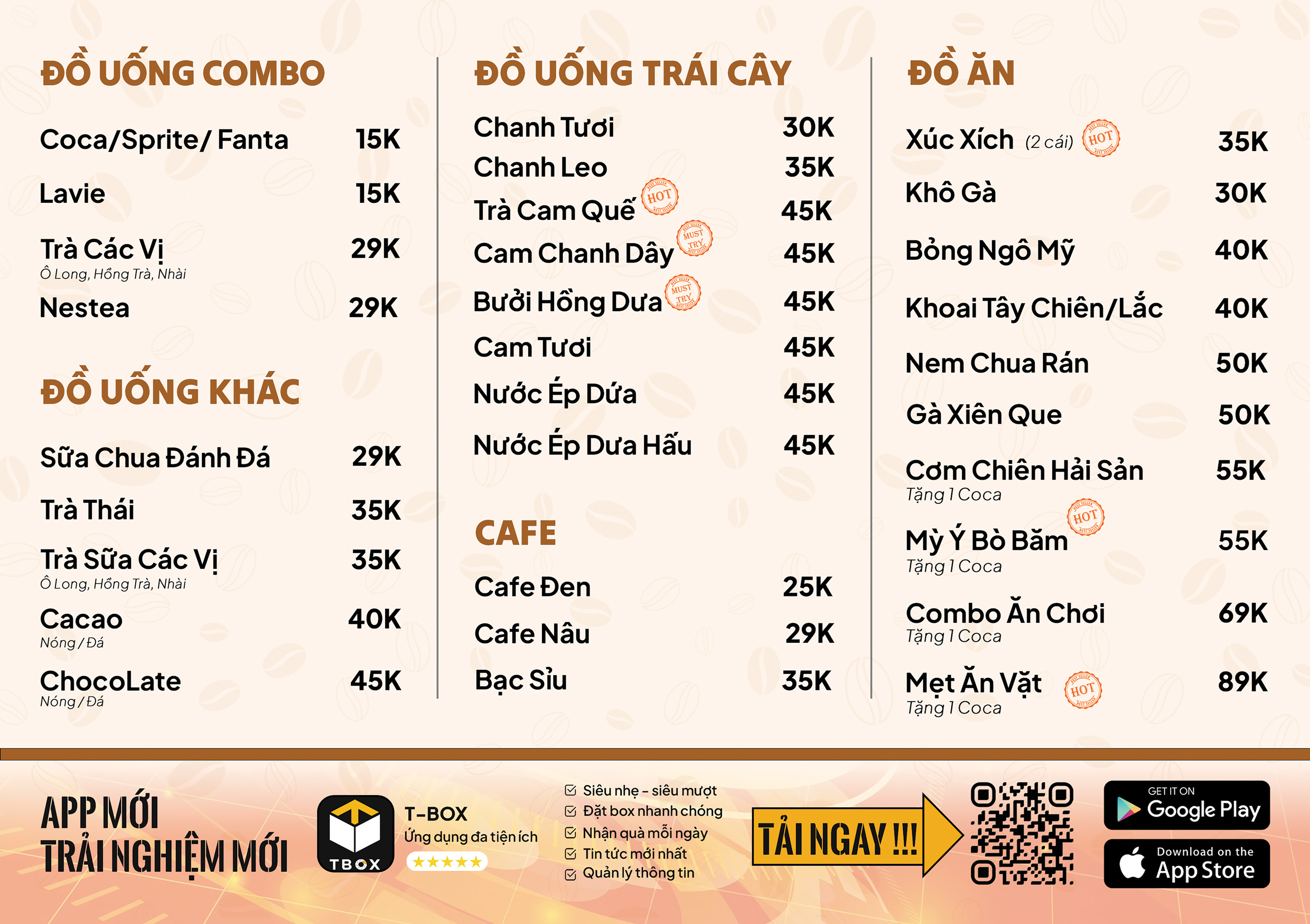 Chúng tôi tự hào giới thiệu menu đa dạng với các loại đồ uống hấp dẫn, từ cà phê thơm ngon đến các loại đồ uống sáng tạo. Bạn cũng có thể tận hưởng các món ăn nhẹ hoặc cơm mì tuỳ ý. Bảng giá của chúng tôi được thiết kế linh hoạt để phản ánh chất lượng và sự đa dạng của sản phẩm.